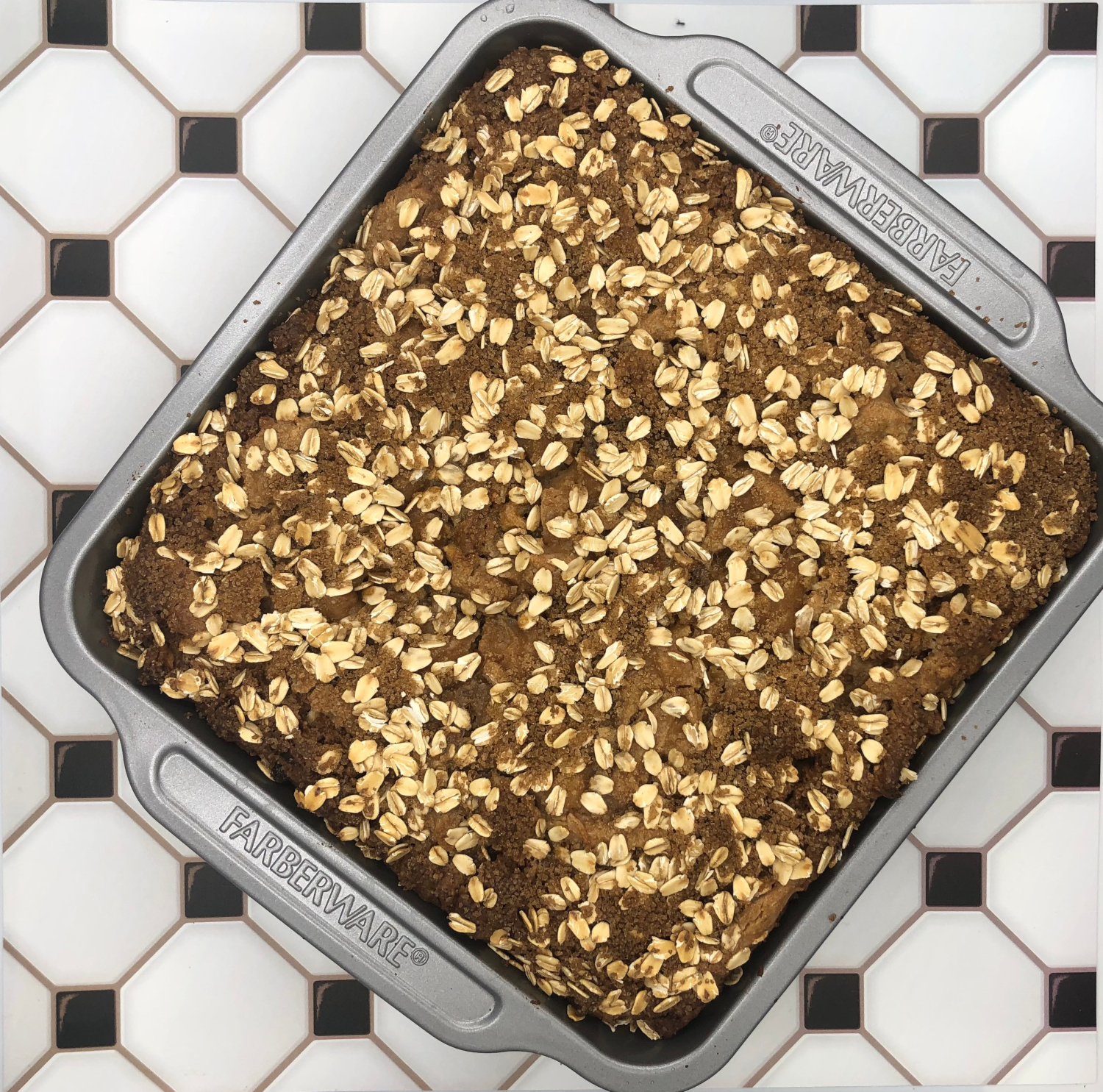 In a new bowl, combine oats, brown sugar, and cinnamon. Sprinkle on top of cake before baking.