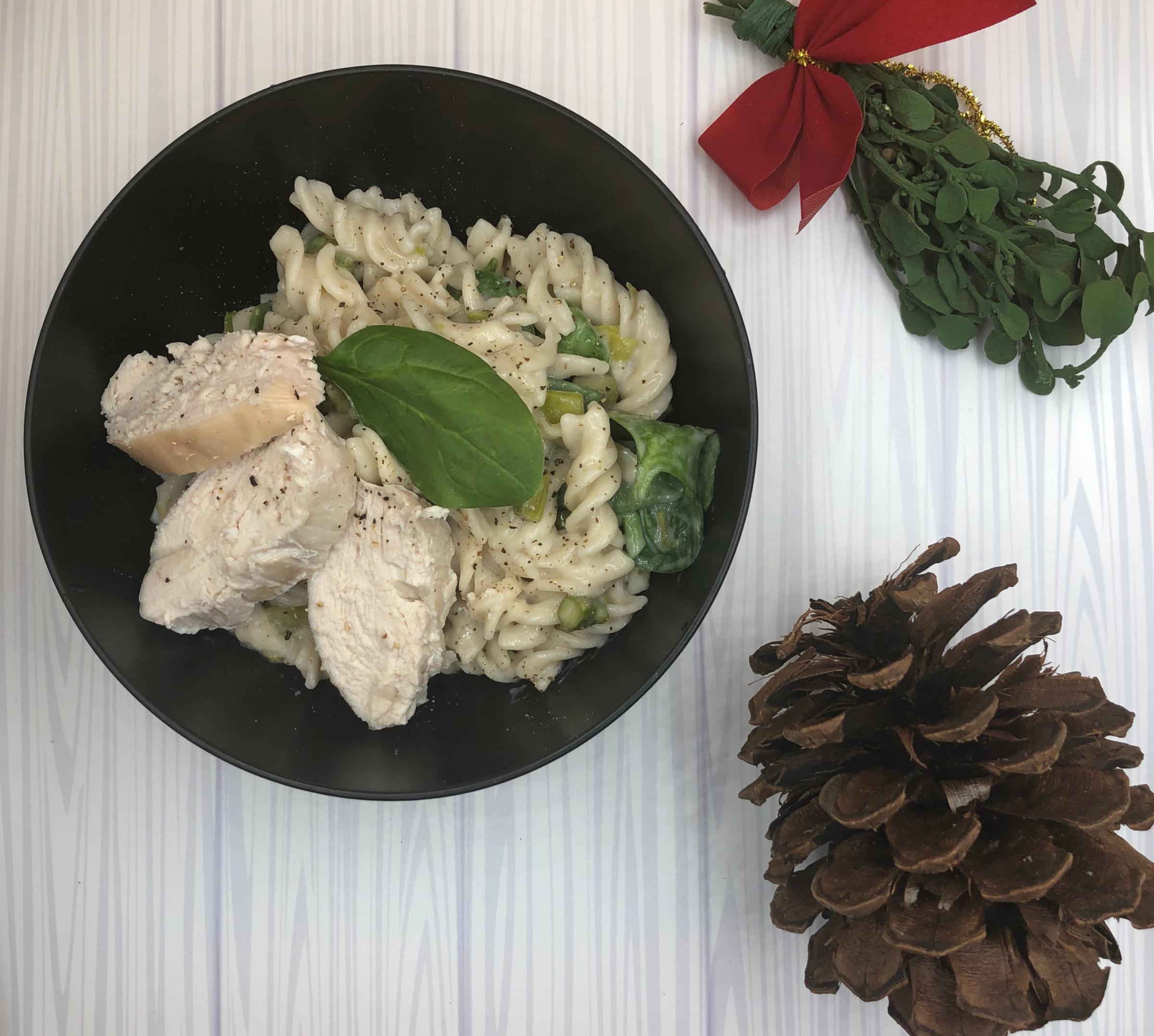 While pasta is cooking/resting, cook chicken (in whatever way is easiest), and chop/shred.