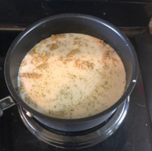 Pour non-dairy milk and water into pot. Add pasta – liquid should just cover the pasta.