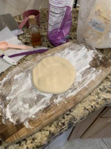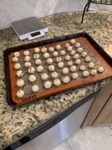 Spread working surface with tapioca starch, and remove dough from bowl and knead for 2 minutes. If dough gets too wet, add 1T of tapioca starch and knead in. The dough will start to sweat quickly if you are in a warm environment – work quickly! Roll out dough and cut into squares. Wrap each cherry with a piece of the dough, making sure cherry is covered evenly on all sides.