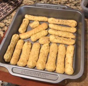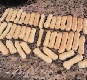 Once mixture is incorporated, spoon mixture gently into piping bag or large Ziploc bag. Cut tip around 1/4-1/2”, and pipe 2-3” inches of batter per cookie onto baking sheets, leaving some space in between (as lady fingers will spread slightly).