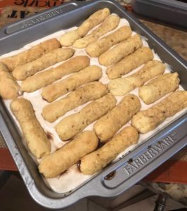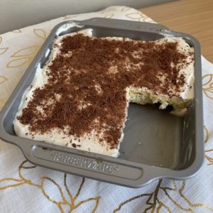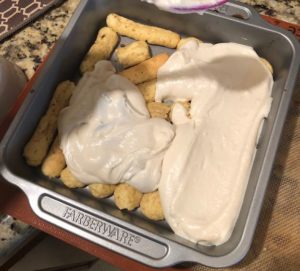 When lady fingers are cool, dip them in coffee, and lay lady fingers in an even layer on the bottom of a 8X8 square baking dish. Top with 2-3T extra coffee.