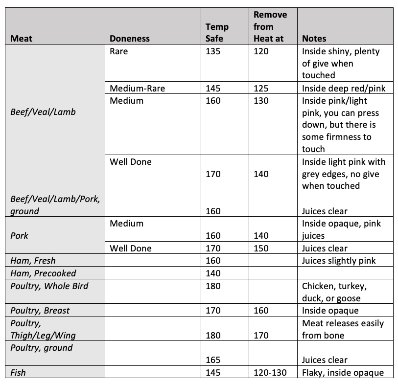 If you want to go by (internal) temperature, remember that the temperature must be taken for the middle of the thickest part of your piece of meat. Taking meat off of the heat slightly prior to doneness helps keep it from being overcooked (as cooking will continue after it is removed from the heat source). Here is a temperature guide to help: